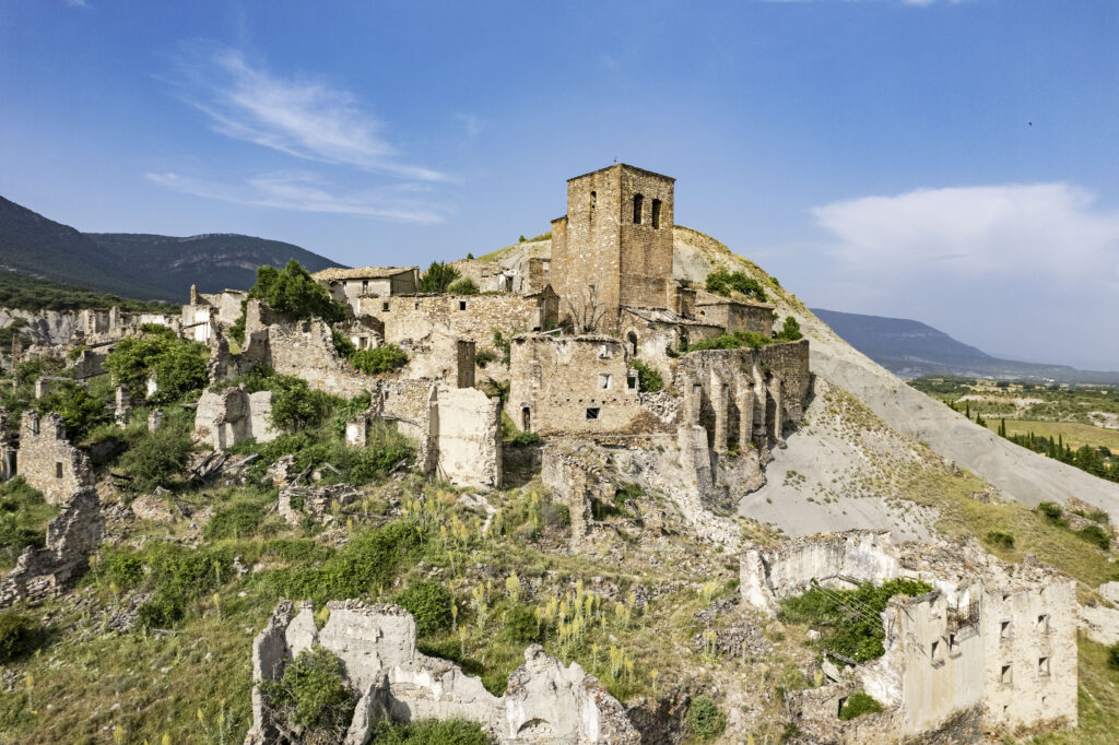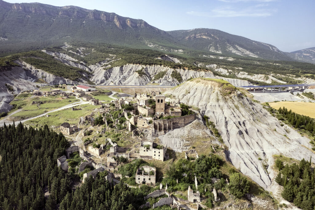 Troviamo un parcheggio mandiamo il drone in avanscoperta. No, non è solo la chiesa, è un intero paese fantasma: Escó.