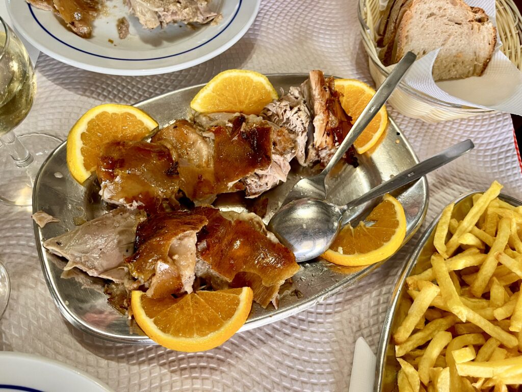 Il maialino era ben cotto, con la cotenna croccante, e il locale, giustamente economico, era frequentato solo da qualche anziano del luogo.